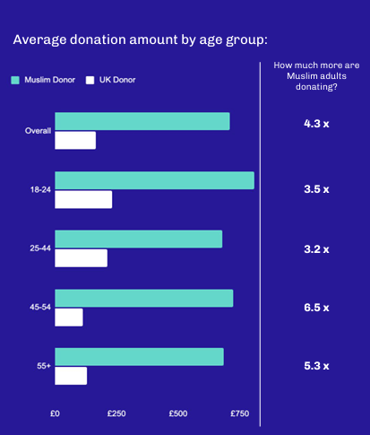 The research by global consultancy Blue State surveyed 1,000+ British Muslims, as well as a nationally representative group of 2,000+ British people, which included 86 Muslims. It found that the average self-reported amount donated in a year by Muslims in Britain was £708, compared with £165 when compared to a nationally representative sample.