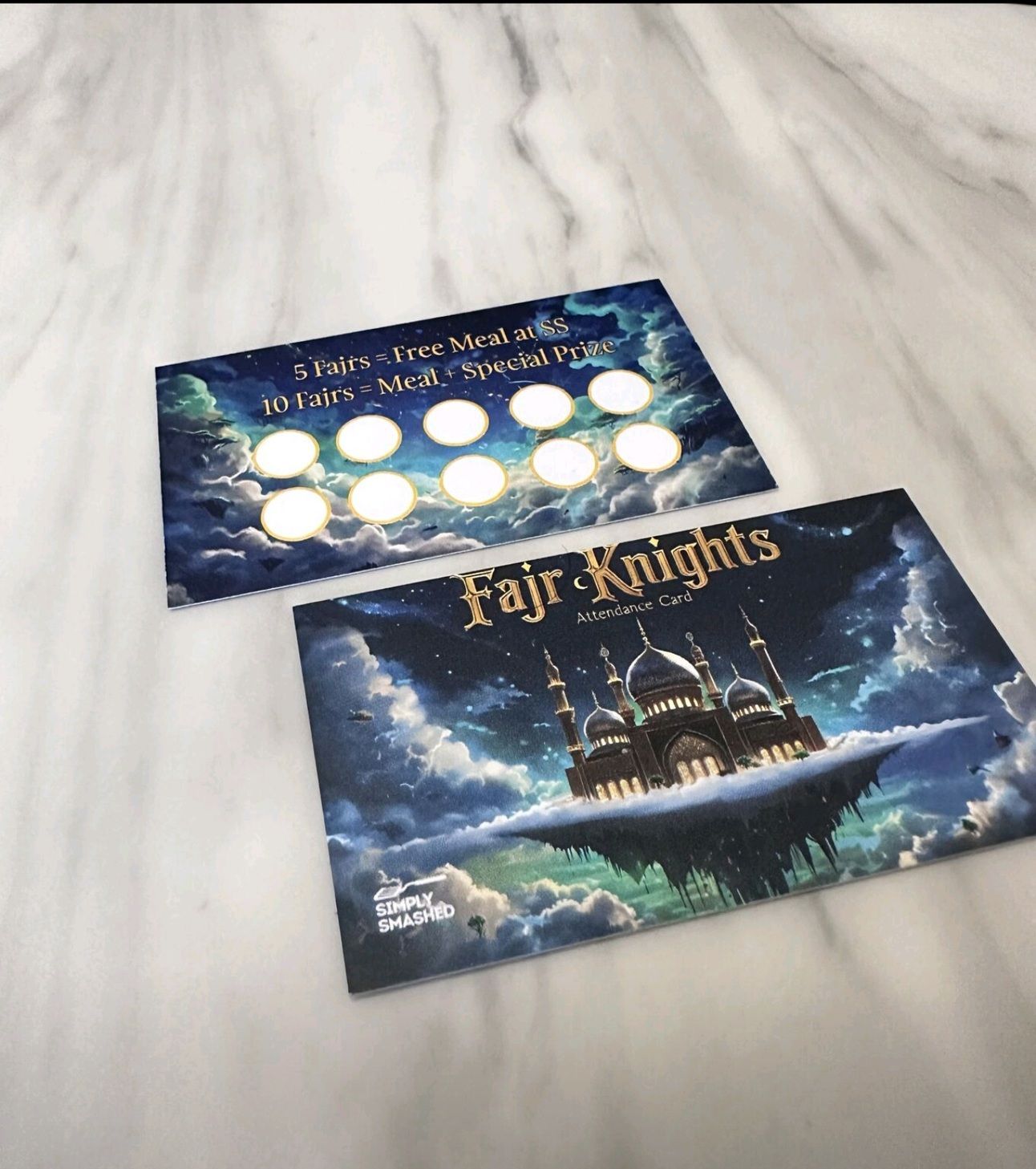 Kids got a stamp on their Fajr Knights card for each Fajr prayer they attend. Collect 10 stamps, and they earned a free meal! It's about building prayer habits and community pride.
