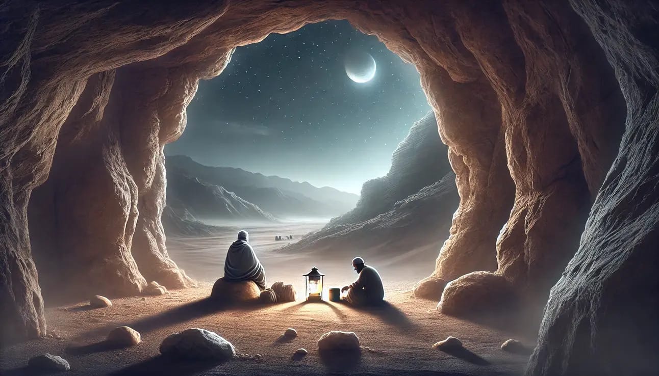 A serene desert cave with two travelers, illuminated by the moonlight, symbolizing trust, determination and Tawakkul.